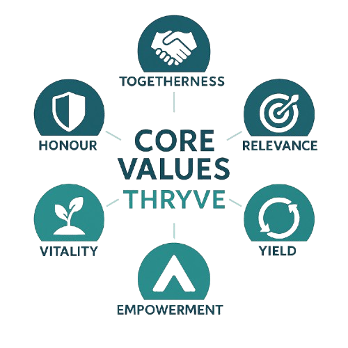 The THRYVE acronym reflects our commitment to building workplaces where people grow together through healthy environments, respect, shared purpose, vitality, and empowerment.